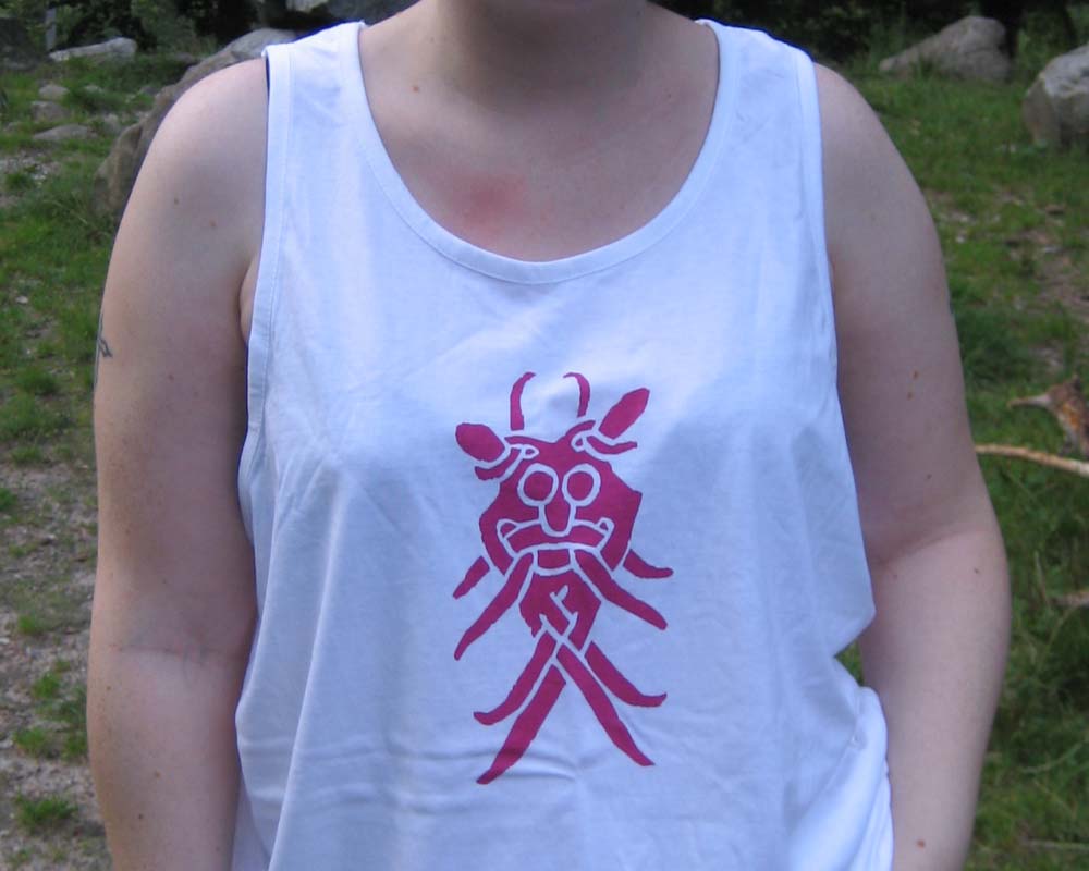 Tank top med billede af Arhusmasken. Fås i hvid med rødt motiv.